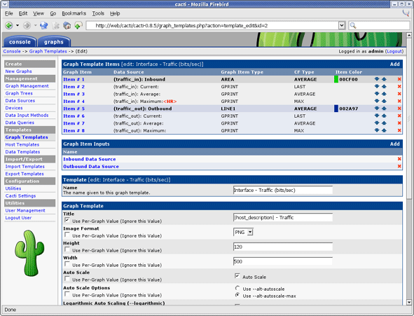 In Cacti, a graph template provides a skeleton for an actual graph. If you have many graphs that share most of their characteristics, using a graph template would probably make sense. After a graph is attached to a particular graph template, all changes made to the graph template will propagate out to all of its graphs, unless Use Per-Graph Value has been checked.